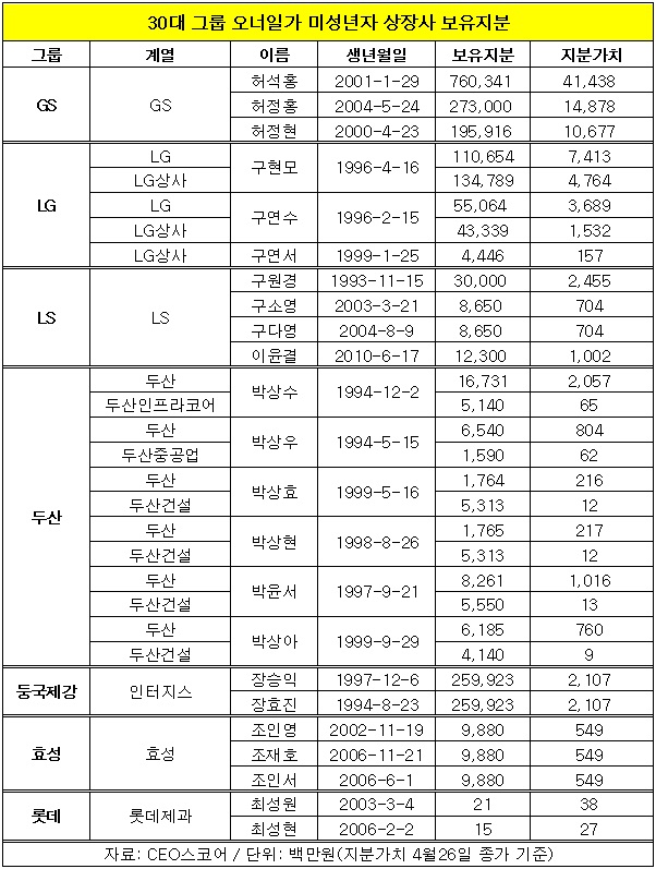이중 10억 원 이상의 주식을 보유한 미성년자는 박정원 두산 회장의 차남 상수(19세) 군과 박태원 두산건설 전무의 장녀인 윤서(16세) 양으로 드러났다.