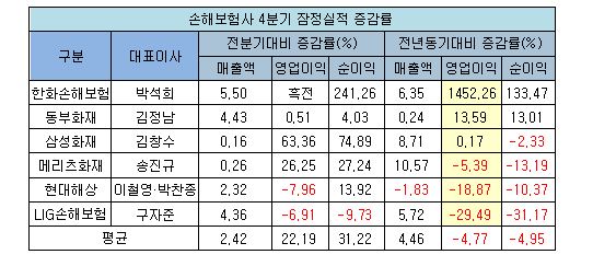 매출이 가장 큰 폭으로 증가한 곳은 메리츠화재로 2012 회계년도 4분기 1조2천억원의 매출을 거두며 전년 같은 기간보다 10.57% 늘었다. 반면 영업이익은 전년 대비 5.39% 감소했다.