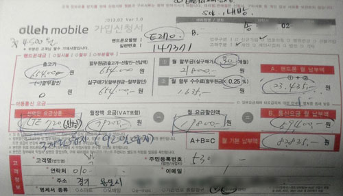 할부원금은 65만4천원이었고 LTE-720 요금제(월 7만9천200원)를 3개월 동안 의무적으로 쓰는 조건으로 30개월 약정으로 매월 2만1천800원의 단말기 할부금은 내는 것으로 계약서를 작성했다.