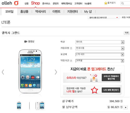 KT가 운영하는 올레샵에 안내된 갤럭시 그랜드의 할부원금은 24개월 약정에 38만4천500원이었다. 결국 올레샵보다 26만9천400원이나 더 주고 구입한 셈이다.