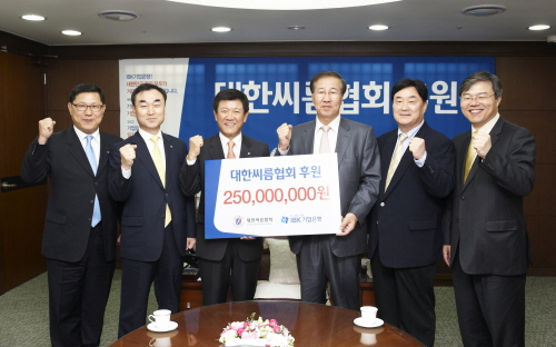 [소비자가만드는신문=윤주애 기자]IBK기업은행(은행장 조준희)이 전통 민속경기인 씨름의 계승 발전을 위해 사단법인 대한씨름협회(회장 박한승)에 후원금 2억5천만 원을 전달했다.