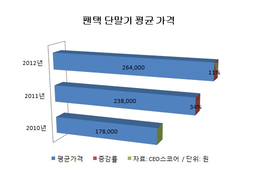 25일 재벌 및 CEO 경영평가사이트인 CEO스코어(대표 박주근)에 따르면 팬택의 단말기 평균가격은 26만4천으로 스마트폰을 처음 선보인 2010년 17만8천 원보다 48%나 올랐다.