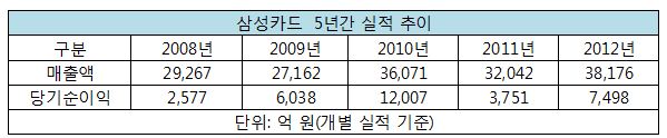 삼성카드는 글로벌 금융위기 당시 매출이 29조2천67억원, 순이익은 2천577억원으로 떨어지기도 했으나 2010년부터 완연한 회복세를 보이며 본격적인 성장곡선을 그리고 있다.