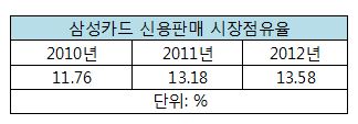 실제 삼성카드는 2010년 신용판매 시장점유율이 11.76%에서 2011년 13.18%, 2012년 14% 수준으로 꾸준한 성장세를 보이고 있다.
