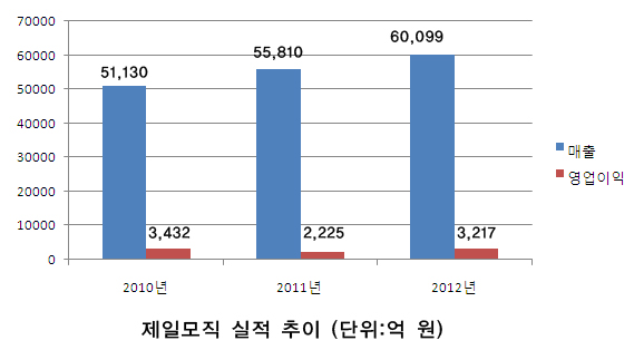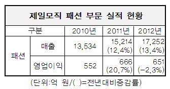 제일모직(대표 박종우, 윤주화) 패션 부문은 지난해 매출 1조7천252억 원(13.4%), 영업이익 651억 원(-2.3%)을 기록했다. 지난 2011년 매출 1조5천214억 원(12.4%), 영업이익 666억 원(20.7%)보다 매출 성장세가 가파라졌다. 단 작년 영업이익 감소는 작년 초 론칭한 에잇세컨즈(8Seconds) 신규투자 비용 때문으로 분석된다.