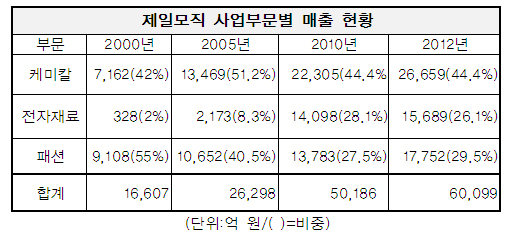 제일모직의 사업부문은 크게 케미칼, 전자재료, 패션 부문으로 나뉜다. 그중 지난 1994년부터 시작된 전자재료사업이 IT 산업 급성장과 함께 2002년부터 본격적인 궤도에 오르면서 2000년 매출 비중 2%에서 2010년 28.%까지 올랐다. 같은 기간 케미칼 부문 역시 2000년 42%에서 2010년 44.4%로 소폭 올랐다.