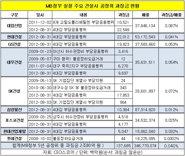 28일 재벌 및 CEO 경영평가사이트인 CEO스코어(대표 박주근)에 따르면 MB정부 시절인 2008년부터 2012년까지 5년간 공정거래위원회가 대림산업과 현대건설 등 9개 건설사에 부과한 과징금은 1천376억 원으로 집계됐다.