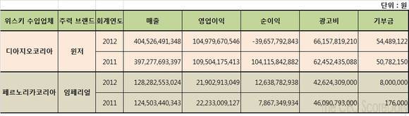 25일 재벌 및 CEO, 경영평가사이트인 CEO스코어(대표 박주근)가 지난 회계연도(2011년7월1일-2012년6월30일) 수입양주업체들의 경영현황을 분석한 결과 디아지오코리아(대표 김종우)와 페르노리카코리아(대표 장 마누엘 스프리에)의 영업이익은 각각 1천49억원과 219억원에 이르렀으나 기부금은 각각 단돈 5천400만원과 800만원에 그쳤다. 영업이익의 2000분의 1수준이다.