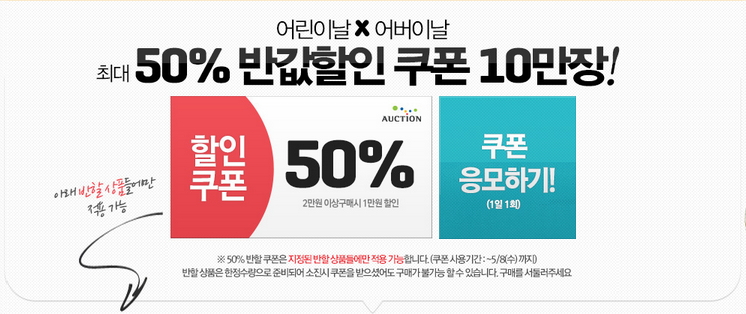 [소비자가만드는신문=이경주 기자]옥션(www.auction.co.kr)이 5월 가정의 달을 맞아 어린이날, 어버이날 선물을 반값에 구입할 수 있는 쿠폰을 10만장 배포한다고 25일 밝혔다.ㅁ
