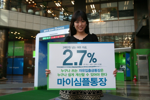 마이심플통장은 금융권 최고수준인 연 2.7%의 금리를 제공하는 입출금이 자유로운 예금으로, 일별 평균잔액 300만 원을 초과하는 금액에 대해서는 단 하루만 맡겨도 연 2.7%의 금리를 제공한다.