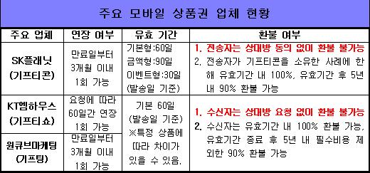 [소비자가만드는신문=김건우 기자] 스마트폰 생활화에 따라 간편하게 선물을 주고 받을 수 있는 모바일 상품권이 인기를 끌고 있는 가운데 주요 업체 별 환불 기준이 달라 소비자들의 혼란이 가중되고 있다.