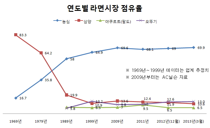 1989년만 해도 삼양이 19.9%의 점유율을 보인 반면 오뚜기는 5.8%로 꼴찌를 기록했다. 이후 삼양라면이 지속적인 점유율 하락을 보이는 사이 오뚜기가 빠른 성장세를 보여 10년 뒤인 1999년에는 순위가 역전됐다. 당시 오뚜기의 점유율은 13.2%, 삼양은 10.9%였다.