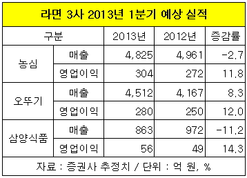 반면 농심과 삼양식품은 같은 기간 매출은 각각 2.7%, 11.2% 줄어들고 영업이익은 각각 11.8%, 14.3% 개선될 전망이다.