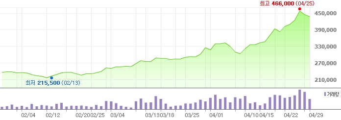 오뚜기는 지난 29일 주가가 43만8천원으로 3달전인 1월 29일(23만5천500원) 대비 무려 86%나 증가했다.
