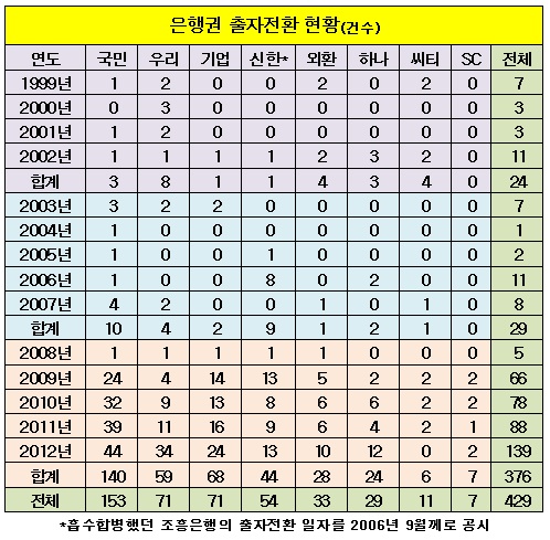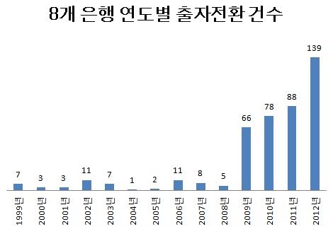 1999년부터 2012년까지 14년 동안 8개 시중은행이 기업여신을 회수하지 못해 출자로 전환한 사례는 429건으로 이중 88%가 이명박 정부 하에서 이뤄졌다.