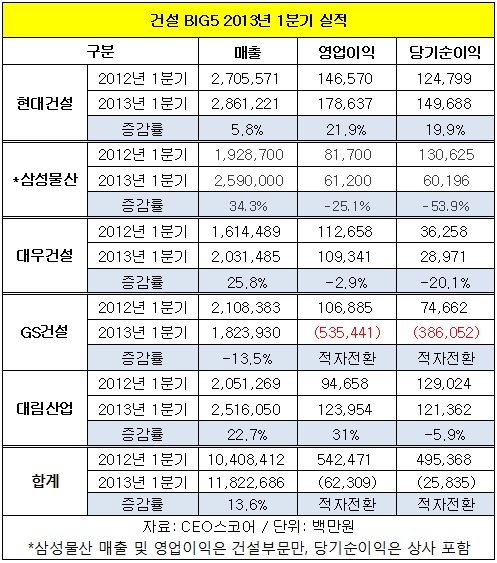 이런 가운데 현대건설(대표 정수현)은 ‘빅5’ 건설사 중 가장 빼어난 실적을 1분기 거둬들여 맏형 역할을 톡톡히 했다.