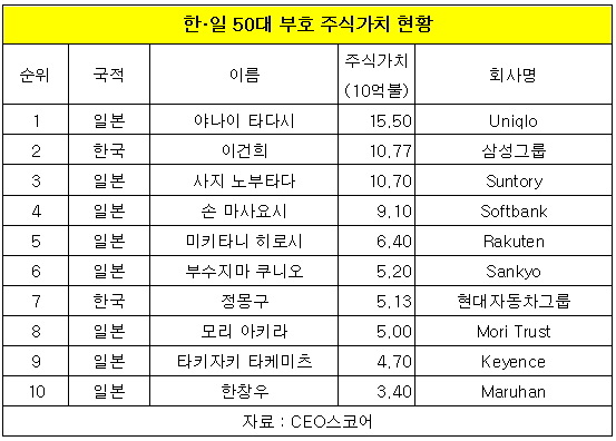 1일 재벌 및 CEO 경영평가사이트인 CEO스코어(대표 박주근)의 조사에 따르면 155억 달러의 상당의 주식을 보유한 일본 유니클로의 창업자 야나이 타다시 회장이 한일 양국을 통틀어 최고의 주식 부자로 꼽혔고 이건희 삼성그룹 회장이 107억7천만 달러로 그 뒤를 이었다.