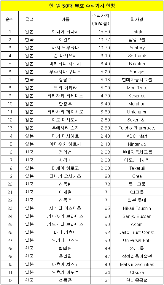이번 조사는 글로벌 경제매거진 포브스 4월호에 실린 일본의 50대 주식부호(4월 기준)와 한국 50대 주식 부자(17일 종가기준)가 보유한 주식가치를 분석해 순위를 매기는 방식으로 이뤄졌다.
