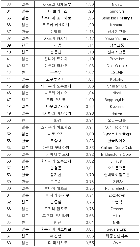 우리나라 주식 부호 가운데 한일합산 20위권에 든 사람은 5명에 불과했고 50위권에는 15명 밖에 포함되지 않았다. 반면 70위부터 100위까지는 3명의 일본부호를 빼고 모두 한국부호가 차지하고 있다.