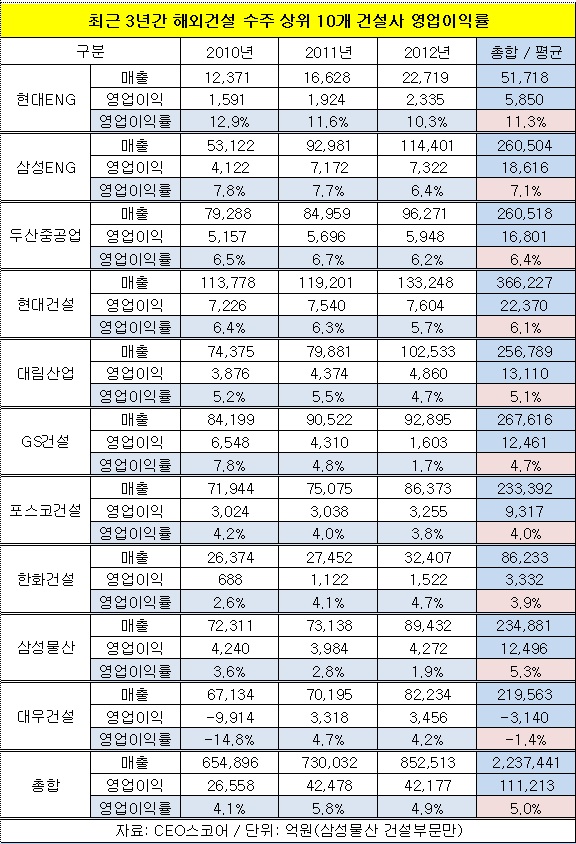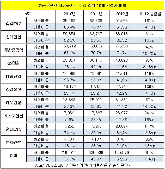 6일 재벌 및 CEO 경영성과평가사이트인 CEO스코어(대표 박주근)에 따르면 해외공사 수주액 기준 상위 10개 건설사가 2010년부터 지난해까지 해외에서 거둔 매출은 총 104조529억 원으로 전체 매출 223조7천441억 원의 46.5%에 달했다. 특히 2010년부터 2012년까지 전체 매출이 30.2% 늘어난 데 비해 해외 매출은 86.9%나 증가해 장기 침체에 빠진 건설사들의 실적 회복에 큰 기여를 했다. 이에 힘입어 10개 건설사는 2010년부터 2012년까 총 11조5천억 원의 영업이익을 거둔 것으로 집계됐다.