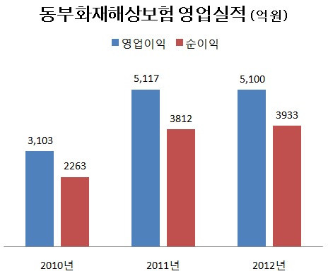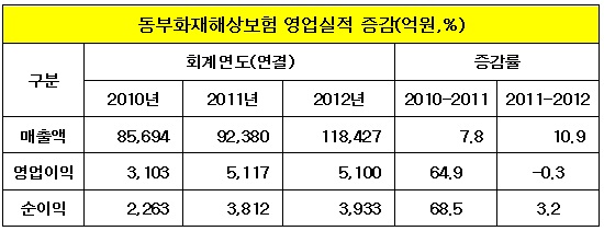 동부화재의 2012 회계년도 매출은 11조8천억 원으로 전년보다 10.9% 증가했다. 이로써 동부화재는 3년 연속으로 매출이 1조 원 넘게 늘었다.