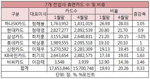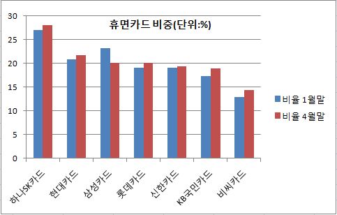 하나SK카드가 1월말 26.98%에서 4월28.03%로 높아져 휴면카드 비중이 가장 높았다.