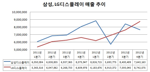 반면 LG디스플레이는 지난해 2분기에는 TV용 LCD 패널 판매량 증가로 1위를 차지했고, 4분기에는 ‘옵티머스G’와 ‘아이폰5’의 판매가 호조를 보인데다 삼성전자와 애플의 특허소송의 영향으로 선전한 것으로 분석된다.