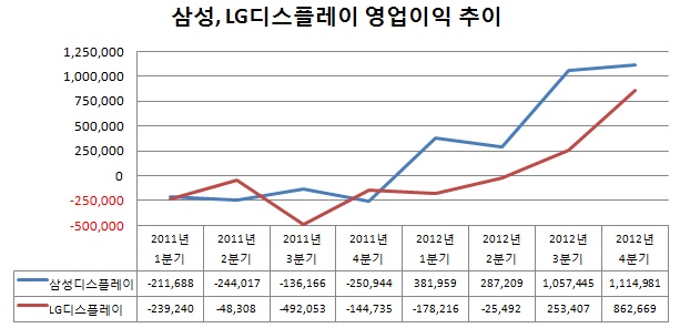 삼성디스플레이의 올해 1분기 영업이익은 7천700억 원으로 LG디스플레이의 1천500억 원에 비해 5배 규모에 달했다. 또 두 회사 모두 흑자전환한 지난해 3분기와 4분기 역시 삼성디스플레이의 영업이익이 4배와 1.3배 규모였다.
