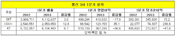 [소비자가만드는신문=김아름 기자] 영업정지라는 빅 이슈가 있었던 통신 3사의 2013년 1분기 맞대결에서 LG유플러스가 판정승을 거뒀다.