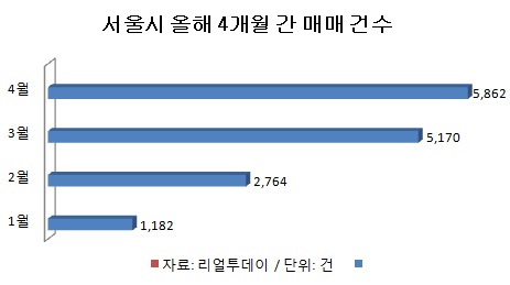 6일 리얼투데이와 부동산114 등에 따르면 올해 4월 서울시 아파트 거래는 총 5천862건이 이뤄져, 1월 1천182건에 비해 5배 수준으로 늘었다.