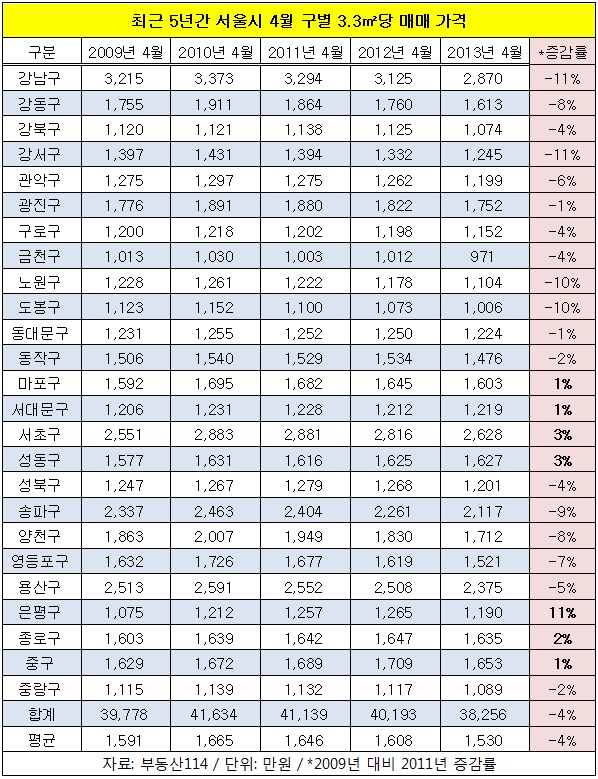 아울러 서울시 내 25개 자치구 중 마포구와 서대문구, 서초구, 성동구, 은평구, 종로구, 중구 등은 3.3㎡당 매매가가 올들어 상승한 것으로 나타났다.
