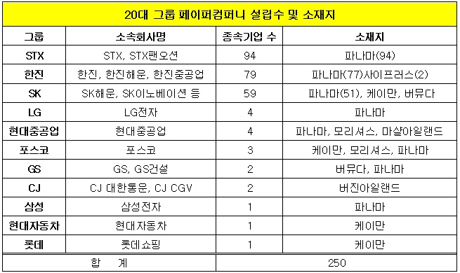한진그룹과 STX그룹, SK그룹이 해운사를 통해 설립한 페이퍼컴퍼니 232개 중 222개가 파나마만 222개가 몰려 있는 것으로 드러났다.