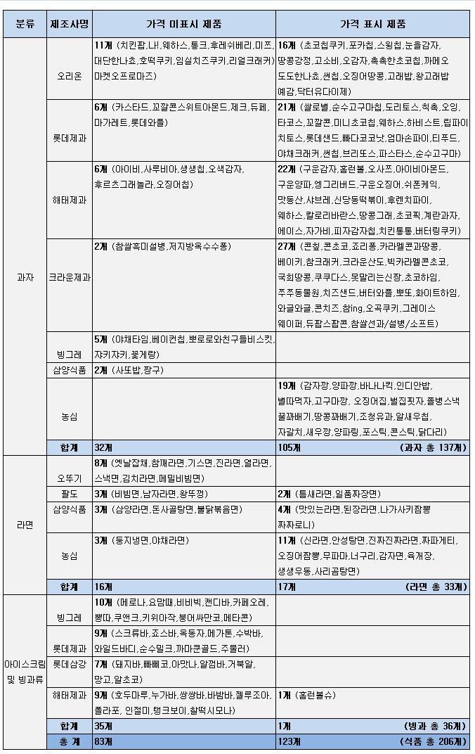 제품수가 가장 많은 과자류의 경우 빙그레는 조사대상 5개 품목 모두 가격 표시를 하지 않았고 농심은 19개 전 제품에 가격을 표시했다.
