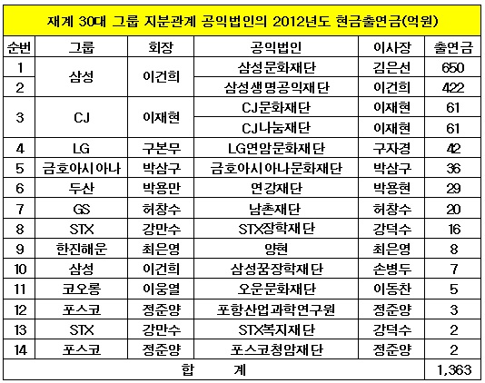 30대 그룹 계열 공익법인이 지난해 모은 출연금의 79%를 삼성 계열의 공익법인이 차지했으며, 30대 그룹이 이들 법인에 직접 출연한 금액 중 94%가 삼성 계열사로부터 나왔다.