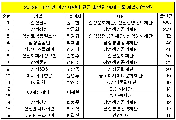 지난해 계열 공익재단(삼성문화재단과 삼성생명공익재단)에 10억 원 이상 현금을 출연한 기업 16개사 중 11개사가 삼성그룹 계열사였다.