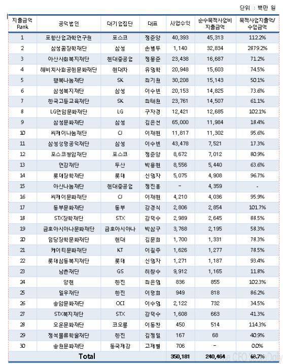 한편 포스코에서 운영하는 포항산업과학연구원(대표 정준양)은 지난해 목적사업비로 가장 많은 453억원을 지출했고 사업수익 대비 활동비 지출비율도 112%로 높긴했으나 다른 공익재단과는 사업성격이 다소 달라 순위에는 포함시키지 않았다.