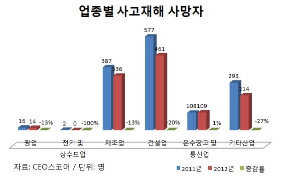 이 가운데 운수창고 및 통신업만 전년도보다 사망자가 1명 늘었고 나머지 업종은 감소했다. 사망자를 가장 많이 낸 건설업의 경우 2011년 577명에 비해 20% 줄었고, 제조업은 13% 감소했다.
