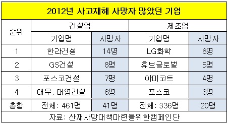이어 구미 불산 유출사고로 5명의 산재사망이 발생한 휴브글로벌(대표 허익상) 2위, 접착제 생산기업인 아미코트가 4명으로 3위, 포스코(대표 정준양)가 3명으로 4위였다.(마이경제 뉴스팀)