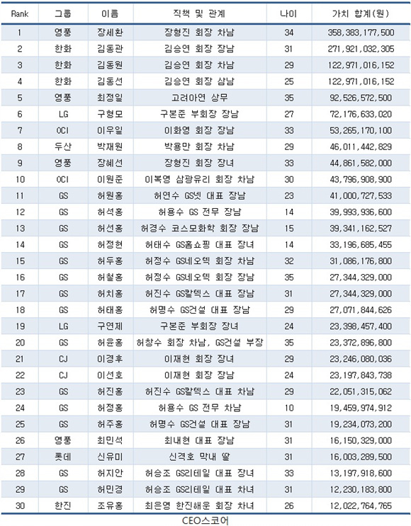 9일 재벌 및 CEO, 경영평가사이트인 CEO스코어(대표 박주근)가 처음으로 국내 30대그룹 총수일가 35세 이하 자녀 들의 상장 및 비상장사 주식보유현황을 조사한 결과 모두 93명의 재벌가 자녀들이 부모 등으로부터 상당액의 주식을 물려 받았으며 그 액수도 1조7천166억원에 이르는 것으로 조사됐다.