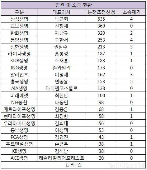 소송제기는 흥국생명(대표 변종윤)이 5 건으로 가장 많았고, 삼성생명과 동양생명(대표 구한서)이 각각 4 건, 신한생명과 알리안츠생명(대표 이명재)이 각각 3 건, 한화생명(대표 차남규)이 2 건을 기록했다. 금융당국은 보험업계가 은행 등 다른 금융권보다 민원이 많다는 판단에 따라 보험사에 민원 감소 노력을 강도 높게 주문하고 나섰다.