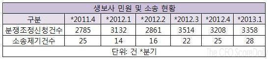 13일 재벌, 최고경영자(CEO) 평가사이트인 CEO스코어 데일리에 따르면 생명보험업계의 분쟁조정신청 건수는 지난 2011년 4분기 2천785 건에서 올해 1분기 3천358 건으로 20.06% 증가했다.