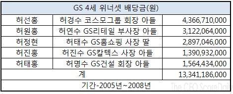 이 기간 동안 GS 4세들은 배당금으로 총 141억 원을 챙겼다. 같은 기간 위너셋의 당기순이익은 117억 원으로 4세들이 챙긴 배당금보다 적었다.