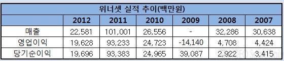 승산산업주식회사에서 사명을 바꾼 2005년부터 2008년까지 4년간 위너셋은 매년 당기순이익보다 많은 배당을 실시해 따가운 눈총을 받기도 했다. 2005년에는 순이익이 22억8천만 원인데 비해 현금배당액은 360억 원에 달해 배당성향이 무려 1천580%를 기록했다.