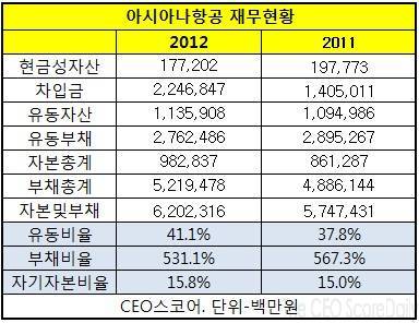 지난해말 기준으로 아시아나의 유동비율과 부채비율, 자기자본비율은 각각 41%, 531%, 15.8%다.
