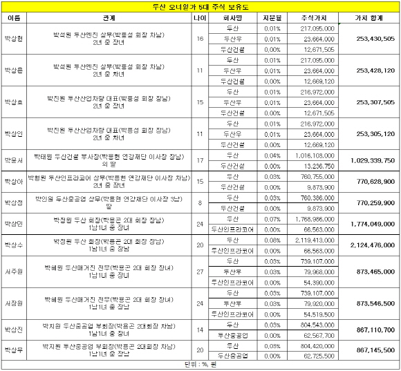 13일 재벌 및 CEO, 기업 경영성과 평가 사이트인 CEO스코어(대표 박주근)이 두산 오너 일가 5세들이 보유한 주식평가액을 조사한 결과, 미성년자 8명을 포함한 13명이 보유한 상장 및 비상장사 주식가치가 총 109억6천만 원에 달하는 것으로 집계됐다.13명 가운데 무려 10명이 딸인 것도 눈길을 끌었다.