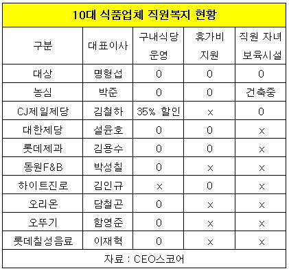 13일 재벌 및 CEO, 기업 경영평가 사이트인 CEO스코어(대표 박주근)가 매출 기준 국내 10대 식품업체의 직원 복지현황을 조사한 결과, 대상은 ‘구내식당’과 ‘휴가비 지원’, ‘직원자녀보육시설’을 다 갖추고 있는 유일한 회사로 밝혀졌다.