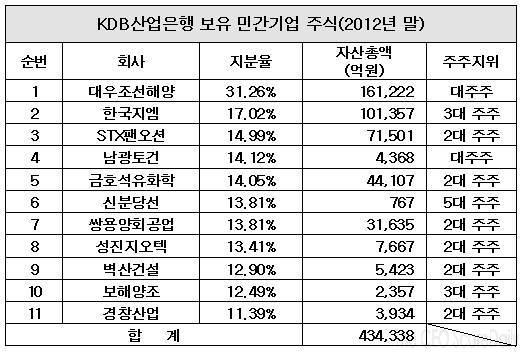이 가운데 대우조선해양과 남광토건은 산업은행이 최대주주로 있으며 STX팬오션과 금호석유화학, 쌍용양회 등 6개사에는 2대 주주, 한국지엠과 보해양조는 3대 주주로 경영에 관여하고 있다.