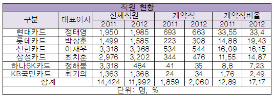 직원 수가 가장 많은 신한카드(대표 이재우)는 3천368명의 직원 중 계약직이 544명으로 계약직 비율은 16.15%를 기록했다. 신한카드는 계약직 비율이 2011년 보다 0.06%포인트 높아졌다.