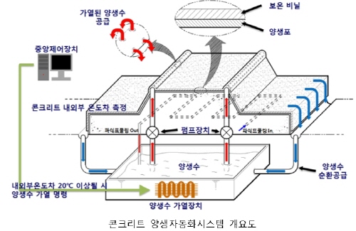 양생자동화시스템은 타설 예정 콘크리트 구조물 중심과 표면부에 온도 측정을 위한 센서를 설치, 온도차가 적정 수준이상으로 벌어지면 자동으로 온수를 공급해 콘크리트의 균열을 방지하는 신공법이다.