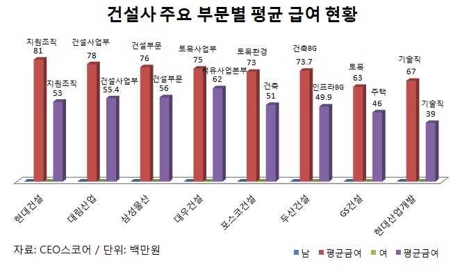포스코건설은 토목환경 부문의 남성 직원 평균 연봉이 각각 7천300만 원으로 가장 많았고 두산건설은 건축BG 남성 직원의 평균 연봉이 7천370만 원으로 제일 높았다.